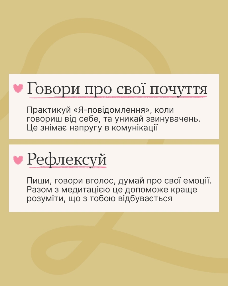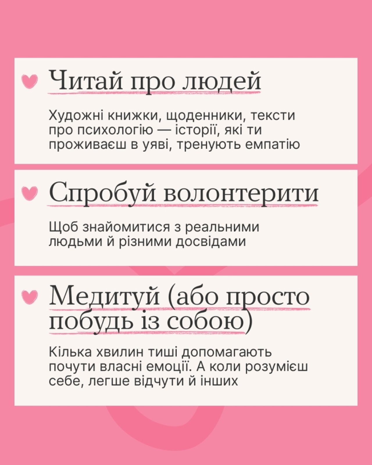 | Емпатія потрібна нам усім, щоб розуміти, співпереживати та підтримувати одне одного. Про це навіть діти у школі знають: до Дня ментального здоров’я для українських учнів проводилися уроки емпатії за підтримки Міністерство освіти і науки України разом із ПЛЮСПЛЮС та 1+1. А тренінги проходили і студенти-першокурсники спільноти університетів «Ти як?» по усій країні. Дещо з уроків емпатії можеш навчитися і ти: ідеї, як прокачувати її, є в каруселі |